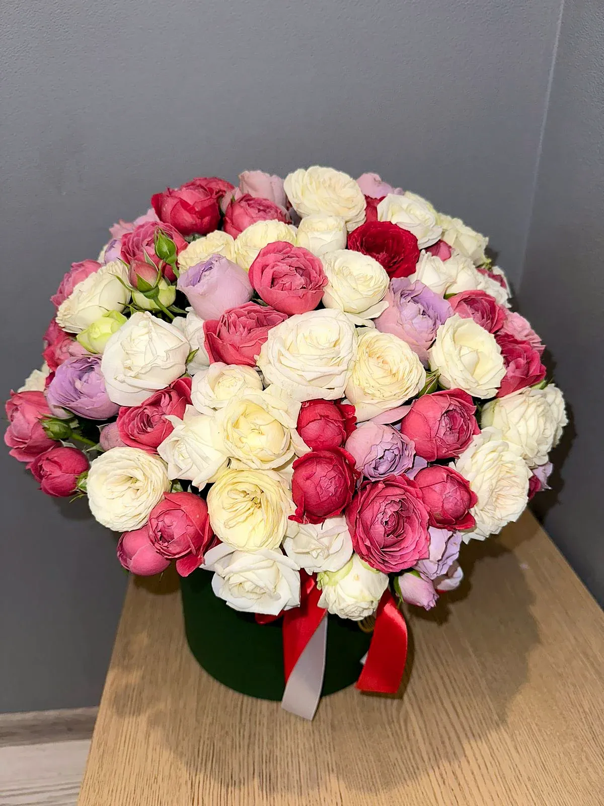 - Оттенок и общее оформление. Кто-то любит букеты в корзинках, другие - в крафтовой бумаге. Важно учитывать предпочтения супруги при выборе подарка!
