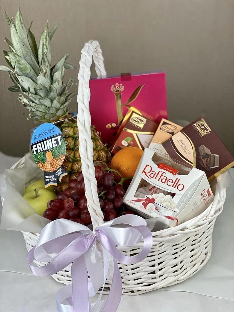 - Корзина фруктов с цветами. Это классический вариант оформления, когда одновременно дарят цветы и фрукты. Элементы или растения могут компоноваться по желанию заказчика.