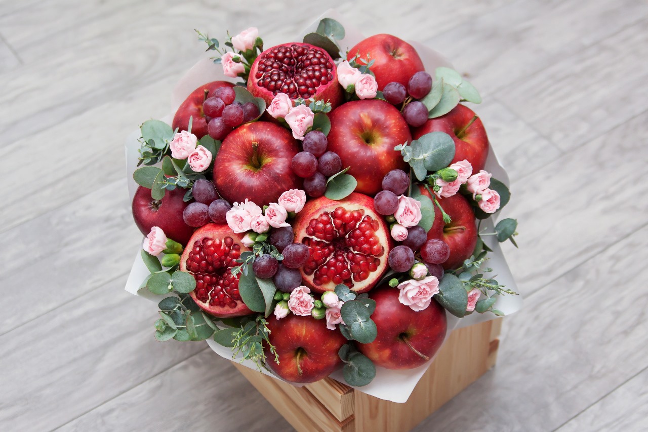 Такие подарки хорошо смотрятся и несут практическую функцию - именинник сможет съесть вкусный сюрприз в любое время и угостить фруктами родных. Такой выбор - отличный вариант для тех, у кого аллергия на цветы.