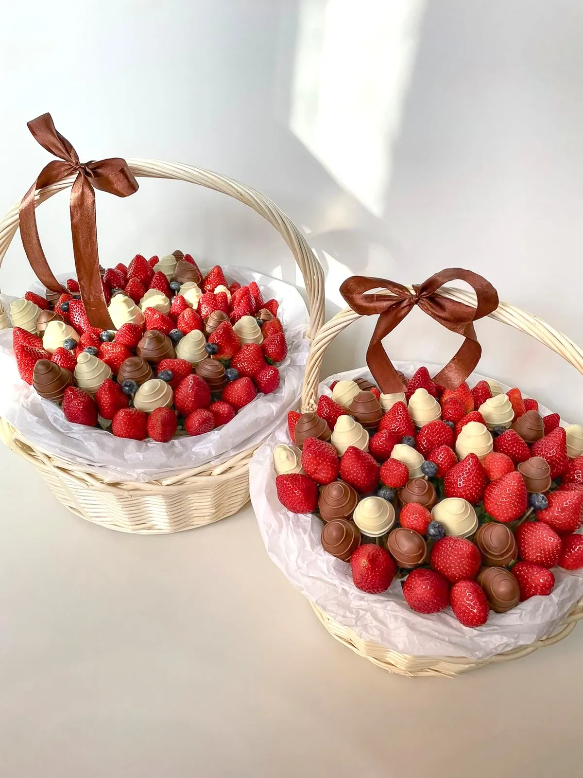 - Удобство. Дарить такие наборы с клубникой и цветами очень удобно. Содержимое не рассыплется и не потеряет красивый вид. Такой подарок можно довести на машине, и подарить в кафе и даже на улице.