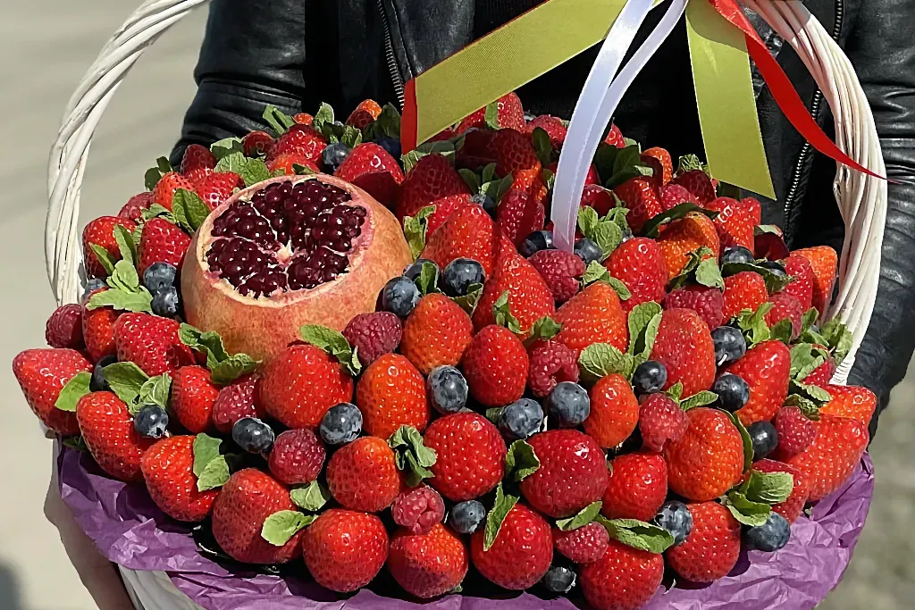 В чем уникальность корзины с клубникой и цветами?